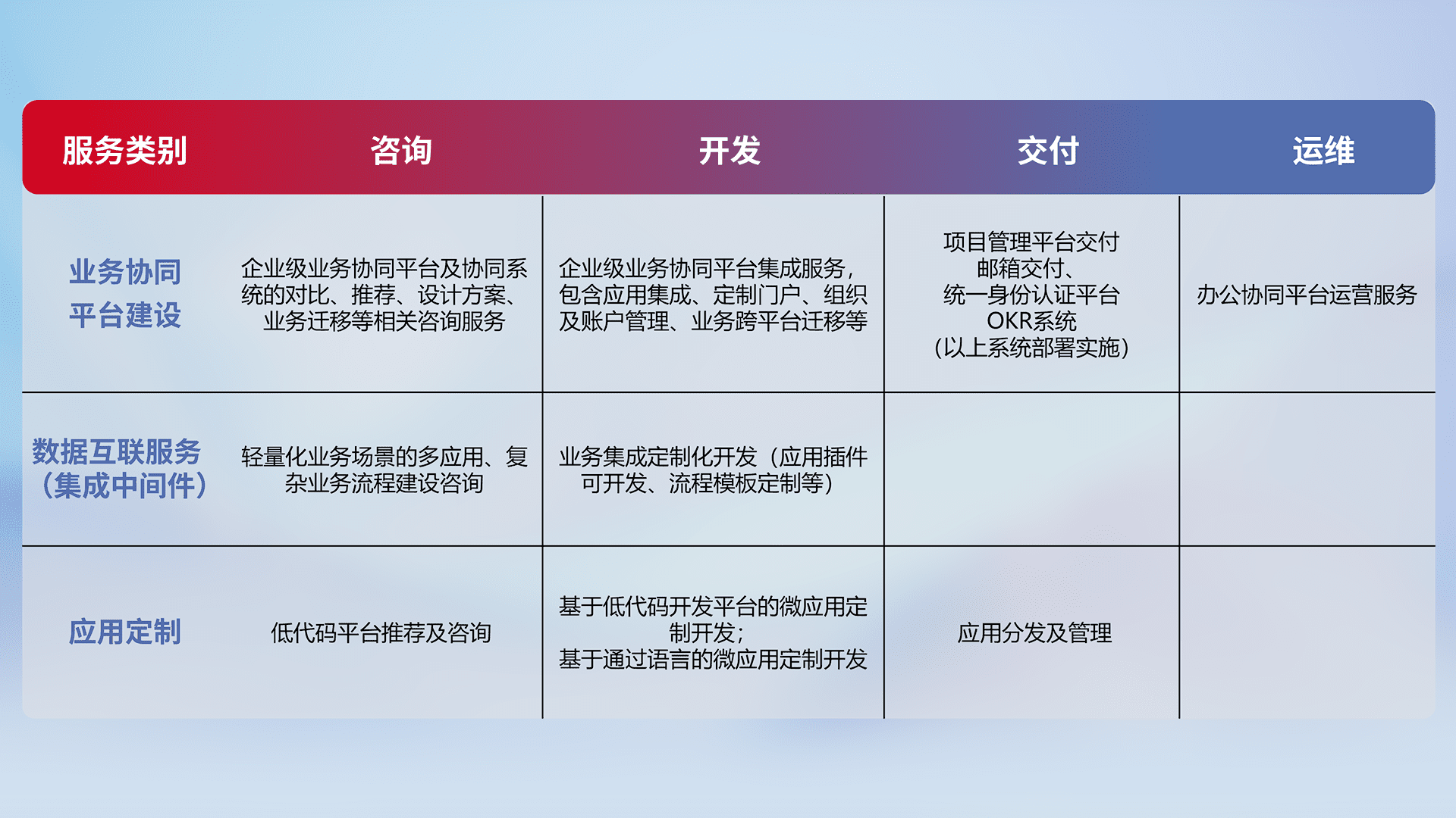 针对钉钉、、企微、、、IDaas等平台级产品提供产品的规划、、、、方案、、、交付、、定制化开发等服务,,实现如统一协同办公、、、、智能客户服务、、混合会议管理、、、、智能数据查询、、、等业务场景,,,实现数字化转型。。。。